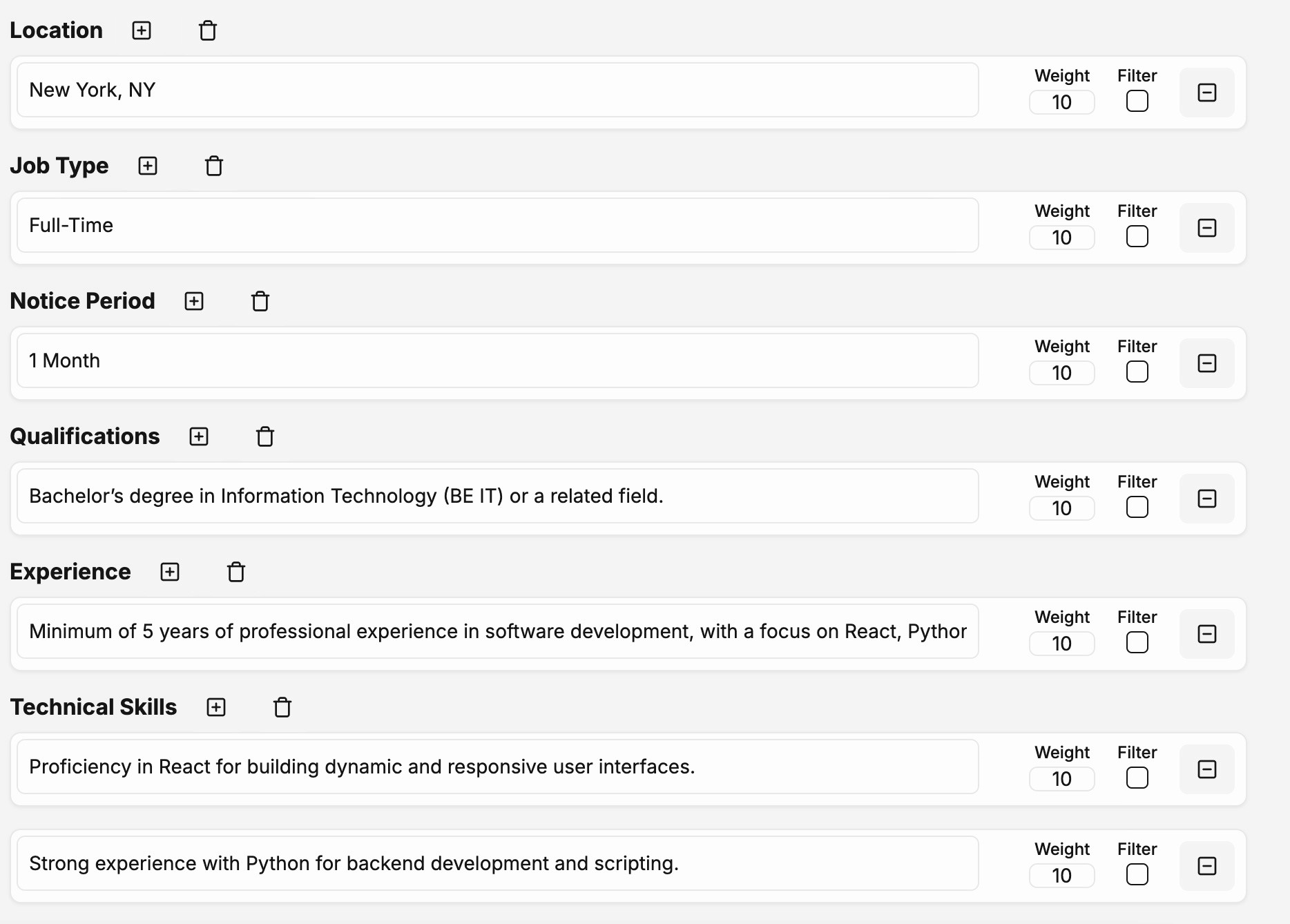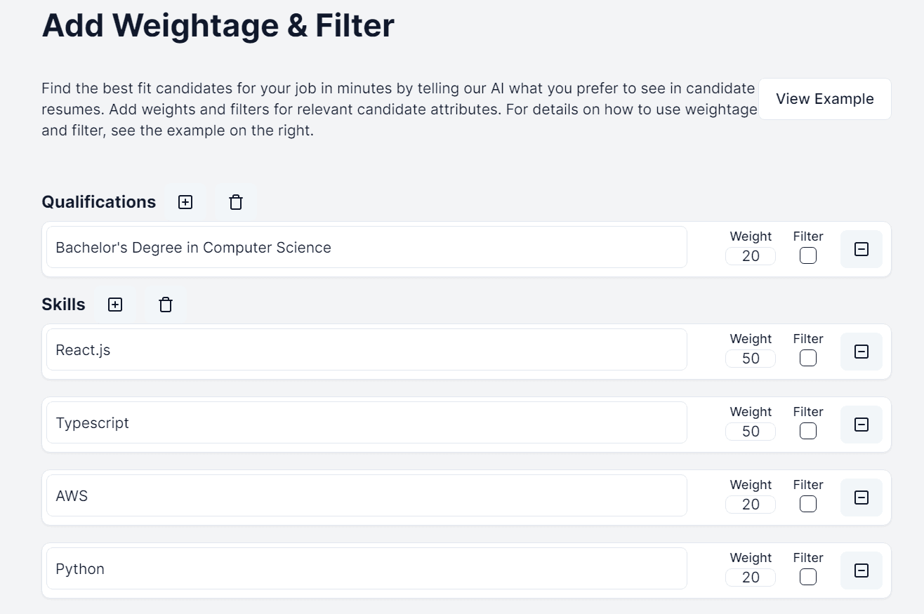 Tell your AI assistant how you want to rank your candidates. Select must-have skills using our knockout filters. Choose other relevant skills by giving them an appropriate ranking weight.